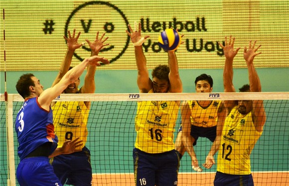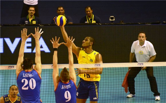 Бразилците взеха малка преднина в началото на първия гейм, но Сърбия не се предаде и обърна до втората техническа пауза. "Плавите" продължиха да водят до 22:20, но домакините успяха да стигнат до 23:23. В крайна сметка момчетата на Никола Гърбич измъкнаха първата част с 26:24. Страхотната игра на Рикардо Лукарели и Леандро Висото помогна на "Селесао" да спечели следващите два гейм. Завърналият се в националния отбор либеро Серджо Сантош показа изключително стабилна игра, което пък позволи на бразилският тим да следва тактиката си. Бразилските волейболисти спечелиха втория гейм с убедителното 25:17, а третия, който бе равностоен като цяло, с 25:22 след ас на Луис Фелипе Фонтелеш. Четвъртата част тръгна равностойно до 6:6, след което в игра за Сърбия се появи звездата на тима Александър Атанасийевич. Благодарение на него "плавите" успяха да поведат с 20:16. Домакините, обаче, изравниха при 23:23. Играта продължи точка за точка, но в крайна сметка сърбите го измъкнаха с 28:26 след ас на Атанасийевич и вкараха мача в тайбрек. Петият решителен гейм тръгна по-добре за бразилците, които поведоха с 4:3 и 8:5. Сърбия намали до 10:9, но все пак Бразилия успя да го спечели с 15:11 благодарение на сервисите на Фонтелеш, а с това и мача с 3:2.