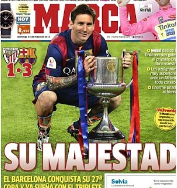 Снощната фамозна игра на Лионел Меси срещу Атлетик Билбао във финала за Купата на краля в Испания помогна за успеха с 3:1. Нападателят на Барселона вкара два от головете, като първият беше истински шедьовър. В тази връзка вестник "Марка" излиза със заглавие, в което се обръща към аржентинеца с "Ваше Величество". Суперлативи не пестят и другите водещи издание на Иберийския п-ов като "АС", "Мундо Депортиво" и "Спорт", като всички акцентират, че това е дубъл за каталунците, а след седмица всичко може да прерасне в требъл при триумф и във финала на Шампионската лига.