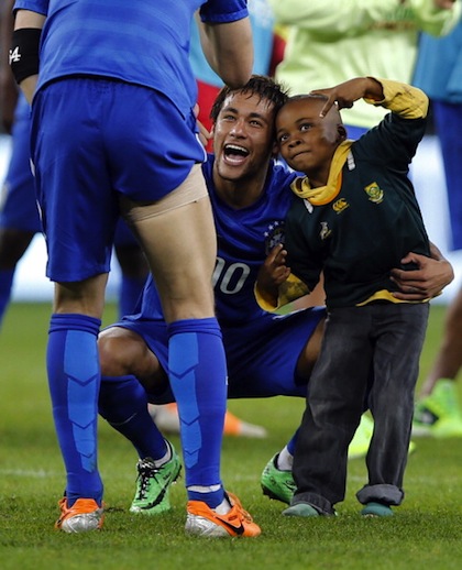 Малко момченце нахлу на терена и се снима с Неймар след края на приятелската среща между ЮАР и Бразилия, завършила с победа с 5:0 за "златистите". Неймар, който реализира хеттрик, и останалите бразилски футболисти реагираха повече от положително на внезапната поява на малкото африканче и дори го вдигнаха на ръце.