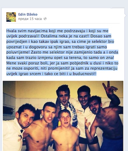 Нападателят на Босна и Херцеговина Един Джеко се нахвърли върху селекционера Сафет Сушич след контролата с Египет в сряда. Чрез съобщение в профила си във "Фейсбук" голмайсторът на Манчестър Сити изрази разочарованието си от факта, че треньорът го е накарал да играе пълни 90 минути, независимо че той е бил с лека травма. "Дойдох с контузия и Сушич го знаеше. Бяхме се разбрали да ме смени на полувремето, но той не го направи. След това през втората част го помолих за смяна, но той пак отказа", написа Джеко.