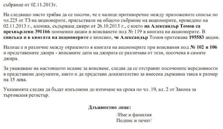 Налице е и несъответствие между списъка на акционерите, алонжа, съдържащ джиро от 26 ноември, с което на Александър Томов са прехвърлени 391 166 поименни акции и вписването в книгата на акционерите, където главният акционер притежава с 50% по-малко акции.