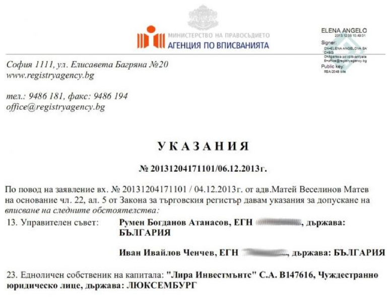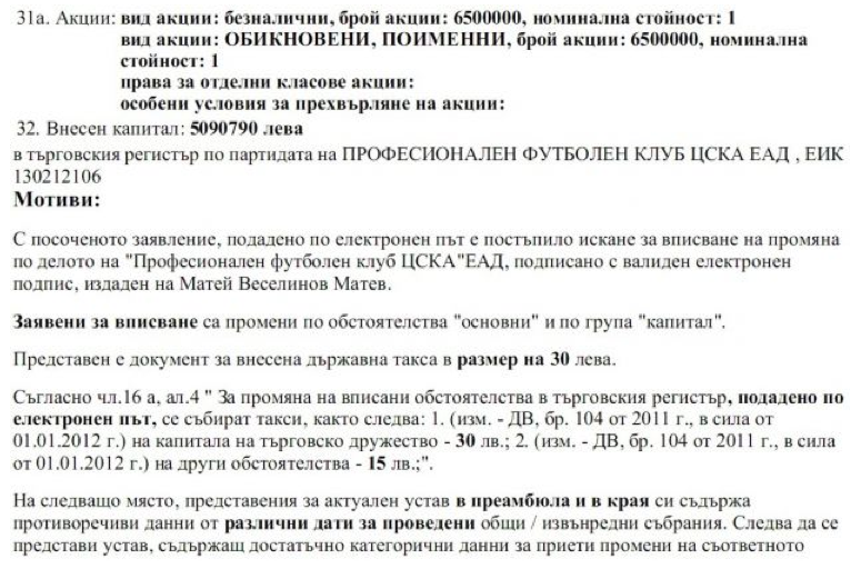 На 6 декември агенцията е дала указания за допускане за вписване на едноличен собственик на капитала на ЦСКА - фирмата "Лира Инвестмънтс", с внесен капитал 5 090 790 лв. Според агенцията обаче представения за актуален устав на клуба съдържа противоречиви данни от различни дати за проведени общи събрания.