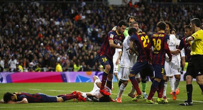 Много емоции и много голове имаше в голямото дерби на Испания Реал Мадрид - Барселона (3:4) вчера, а не липсваха и спорни моменти. Халфът на каталунците Серхио Бускетс пък направи нещо много грозно по време на поредното издание на "Ел Класико", стъпвайки върху главата на лежащия на земята защитник на "лос бланкос" Пепе. Вижте ситуацията.