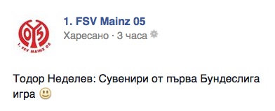 Днес във Facebook профила на Майнц се появи екипът на Тодор от дебютния му мач. Снимката беше придружена с текст на развален български: "Тодор Неделев: Сувенири от първа Бундеслига игра".