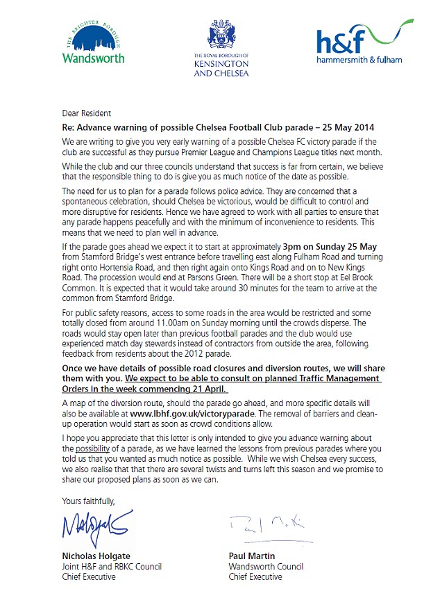 "Дейли мейл" публикува писма, които общината е изпратила до 55 хиляди домакинства в западната част на Лондон, в които се съобщава за евентуални затваряния на улици на 25 май - ден след финала на Шампионската лига. Тогава би трябвало да бъдат организирани тържествата по повод спечелването на поне една от двете купи, до които Челси има доста добър шанс да стигне.