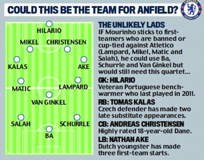 И въпреки че това е наказуемо в Англия, Моуриньо може да излезе със следния състав срещу Ливърпул: Енрике Иларио, Джон Оби Микел, Андреас Кристенсен, Нейтън Ейк, Томас Калас, Франк Лампард, Неманя Матич, Марко Ван Хинкел, Мохамед Салах, Андре Шюрле и Демба Ба, прогнозира "Дейли Мейл".