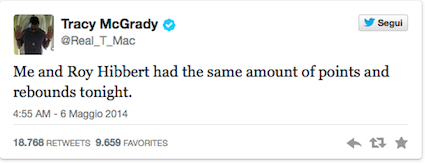"Аз и Рой Хибърт имаме еднакъв брой отбелязани точки и овладени борби тази вечер", написа седемкратният участник в Мача на звездите и двукратен топреализатор на НБА.