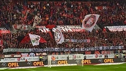 На поредна проява на хомофобия станаха свидетели футболните фенове в Германия. След като през март по време на мач от Шампионската лига запалянковци на Байерн (Мюнхен) опънаха плакат с антигей насоченост, нещо подобно сториха сега и ултрасите на Байер (Леверкузен). Това се случи по време на двубоя с Вердер (Бремен) (2:1) в събота от последния кръг на Бундеслигата.