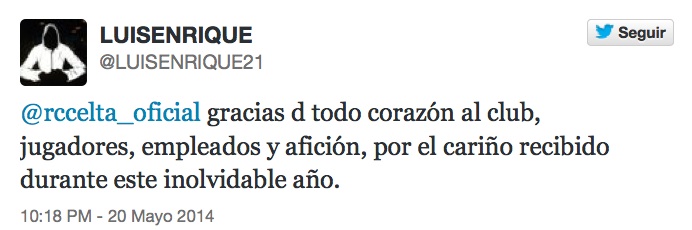 Новият старши треньор на Барселона Луис Енрике използва социалната мрежа Twitter, за да се сбогува с досегашния си отбор Селта. "Благодаря от цялото си сърце на клуба, играчите, всички в клуба и публиката за получената обич през тази незабравима година", написа той вчера вечерта.