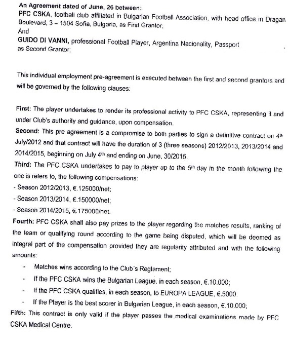 Аз съм лицензиран футболен агент и представлявам Гуидо ди Вани от юни 2012 г., когато той подписа с ЦСКА. Разполагам с документи, с които мога да докажа думите си. Въпросният футболист тогава бе представен на треньора Стойчо Младенов от моя партньор по това време Руи Мигел Гомеш. Двамата са големи приятели от времето, когато Младенов беше в португалския „Олянензе". Също така и са партньори във футбола, работиха заедно в Египет. Руи Гомеш обаче не е лицензиран агент. Затова имаше нужда от моята мениджърска дейност. През 2012 г. ме помоли да участвам в сделките с ЦСКА за няколко футболисти. Става дума Фабио Нунес, Педро Мендес, Нилсон Антонио, Тенгариня, Таргино, Гуидо ди Вани и Лукас Винисиус Силва. По тяхното преминаване в ЦСКА работихме аз, Гомеш и Младенов. Договорите на играчите бяха уговорени от тях двамата след дълги телефонни разговори. Помня например как Руй Гомеш сновеше с часове насам-натам в моловете „Сердика" и „The Mall" в София, докато се чакаше развитие по трансферите...