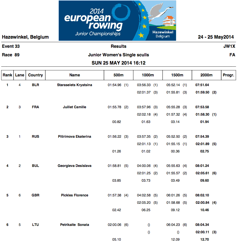 Деси Георгиева измина дистанцията от 2000 метра за 8:01.24 минути и бе изпреварена само от шампионката Кристина Стараселец от Беларус (7:51.64) и нейните подгласнички Камил Жулиет от Франция (7:53.58) и Екатерина Питримова от Русия (7:54.39).