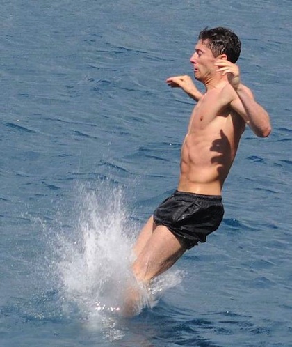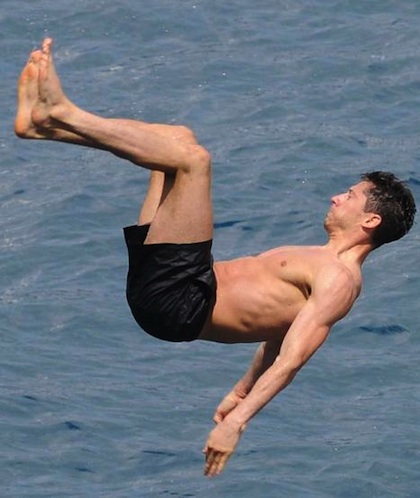 Новото звездно попълнение на Байерн (Мюнхен) Роберт Левандовски се отдаде на заслужен отдих веднага след края на сезона в Германия. Вместо да стяга куфарите за Бразилия и да гледа Мондиала като зрител, досегашният нападател на Борусия (Дортмунд) замина на почивка в Италия. Там той и жена му наеха яхта в Портофино и заедно с техни приятели започнаха разходка по Средиземно море. Полякът демонстрира защо е известен и като Тялото заради релефните си форми. Освен всичко Левандовски показа отлична пластичност при скоковете във водата.