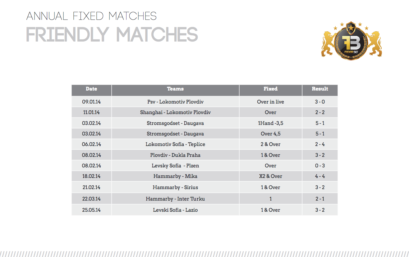 Организацията разкрива освен мачовете, които според нея са били уредени, така и залозите, които са били направени на тях. Една от българските срещи дори е заложена на точен резултат докато се провежда. Това е бургаското дерби между Черноморец и Нефтохимик, като заложилите са спечелили от точен резултат 4:0. Повече от половината приятелски срещи, които според "Федербет" са били уредени, са с участието на български тимове. Голям принос за това има турнето на Локомотив (Пловдив) в Испания през зимата, предизвикало сериозни съмнения още по време на провеждането си.