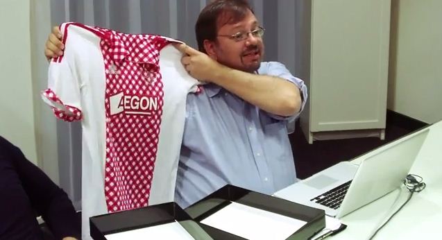 Германският мегаконцерн "Адидас" предприе изключително любопитен ход за популяризиране на новите екипи на холандския шампион Аякс. Част от рекламната кампания на новите фланелки на гранда от Амстердам бе номер със скрита камера, който от производителя на спортни екипи спретнаха на мениджъра на клуба от "Амстердам АринА" Франк де Бур и звездите в неговия отбор Сим де Йонг, Дали Блинд и Яспер Киленсен. Тримата футболисти и мениджъра бяха привикани на предварителен разговор с актьор, представящ се за директор в "Адидас" и директора в клуба Едвин ван дер Сар, на който да изкажат мнението си за новите фланелки, които трябва да обличат през сезон 2014-15.