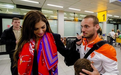 Звездата на Холандия Уесли Снайдер бе в приповдигнато настроение при заминаването на отбора за Бразилия днес на летище "Шипхол". Куп футболни съпруги и дузина малчугани изпратиха самолета на "лалетата", които преди да се качат на борда позираха за снимки.