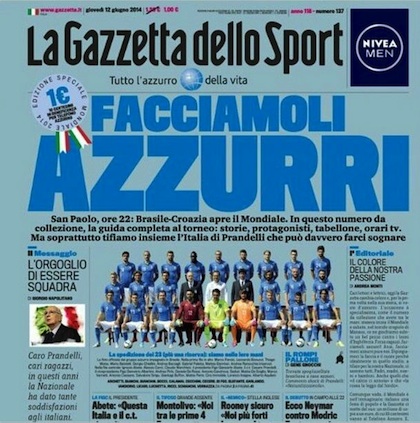 Авторитетното италианско издание "Гадзета дело Спорт" днес не излезе в традиционния за вестника розов цвят и за първи път в историята си заложи на синьото. По този начин "Гадзета дело Спорт" изрази подкрепата си за италианския национален отбор, който е сред участниците на започващото днес световното първенство в Бразилия. В синьо днес е и интернет сайтът на изданието.