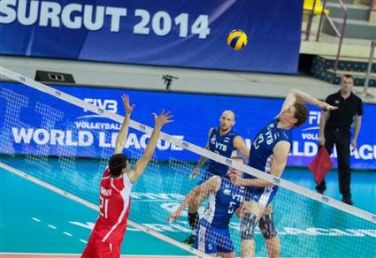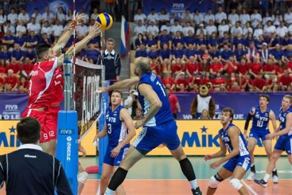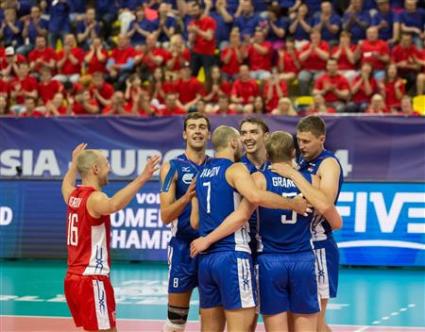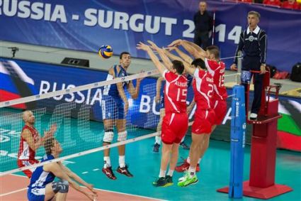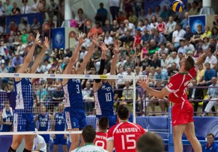 РУСИЯ: Сергей Гранкин, Николай Павлов 12, Денис Бирюков 9, Сергей Савин 4, Дмитрий Мусерский 15, Николай Апаликов 5 - Алексей Вербов-либеро (Денис Земченок, Тарас Хтей 5, Артьом Волвич 3)