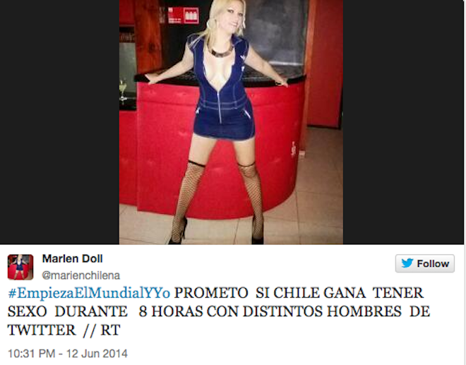 Всеки фен обича да празнува победите на любимия си отбор по различен начин. Чилийската порнозвезда Марлен Дол обаче "поля" доста нетрадиционно успеха на своите сънародници с 3:1 над Австралия в първия им мач от световното първенство в Бразилия. Преди мача в петък с "кенгурата" Марлен обяви в профила си в "Туитър", че ще бъде на разположение за 8-часов сексмаратон, ако Чили вземе трите точки. След като това все пак стана факт, г-ца Дол спази обещанието си и дори увеличи времето от 8 на 12 часа. Марлен е дала телефонния си номер в социалната мрежа, за да могат желаещите да се включат в забавлението да се свържат с нея.