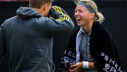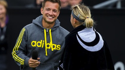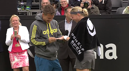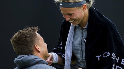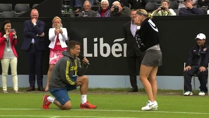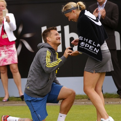 Холандската тенисистка Михаела Крайчек постигна много повече от една победа на корта вчера. След като се наложи над Яна Чепелова с 6:3, 4:6, 6:1 в първия кръг на турнира в Хертогенбош, нейният приятел Мартин Емрих излезе на корта, падна на колене и поиска ръката на своята любима. Двамата са се запознали точно преди една година по време на същия турнир, а специалистът на двойки обяви пред всички огромната си любов към малката сестра на легендарния Рихард Крайчек, като в крайна сметка чу заветното "Да" и сватбеният марш огласи корта.