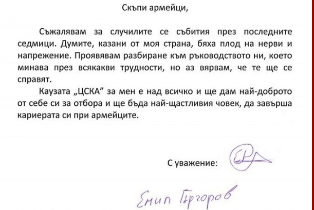 Ето съобщението, което сайтът на ЦСКА публикува от името на Гъргоров: