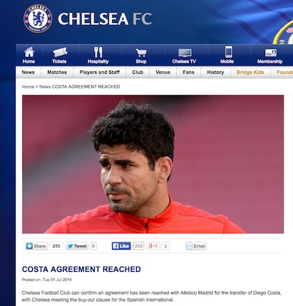 Челси официално обяви привличането на Диего Коща от Атлетико Мадрид чрез материал на официалния си сайт. "Челси потвърждава за постигнато споразумение с Атлетико за трансфера на Коща, като това ще стане факт чрез плащане на клаузата за откупуване, която е записана в договора на испанския национал", обявиха лондончани.