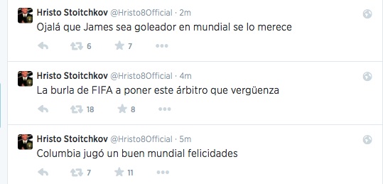 "Дано Хамес стане голмайстор на Мондиала, заслужава го", написа две минути по-късно бившият национален селекционер. "Колумбия направи силен турнир, поздравления", сподели още той в социалната мрежа.
