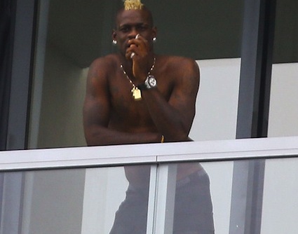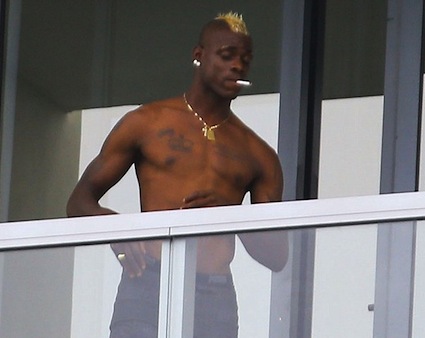 Нападателят на Милан, който миналата година беше глобен за същото прегрешение от вицепрезидента на "росонерите" Адриано Галиано, очевидно не е успял да се откаже от вредния навик. Той дори не се и крие, след като папарак го излови да пафка невъзмутимо на терасата на хотелската си стая. Предишния път Балотели бе спипан в тоалетната на влак.