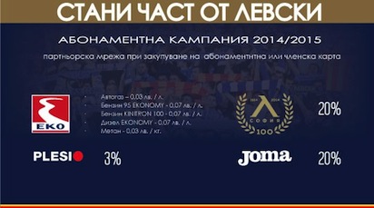 подновен сезонен билет с 30% (25%+5%) отстъпка за членство в ПФК Левски 70 лв. + 24 лв. = 94 лв.