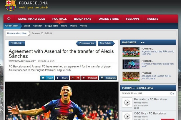 В 5,31 часа централноевропейско време в сайта на Барса се появи новина за трансфер на чилиеца в лондонския клуб. Британското издание е направило "скрийншот" на новината. Малко след качването материалът беше изтрит от официалния сайт на "блаугранас".