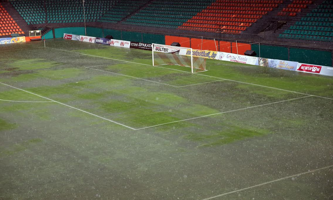 Пратениците на Sportal.bg, които с мъка се добраха до стадиона, видяха, че по-голямата част от тревното покритие е във вода. Наводнени са и двете резервни скамейки, които са вкопани в земята. Там водата достига 70 сантиметра.