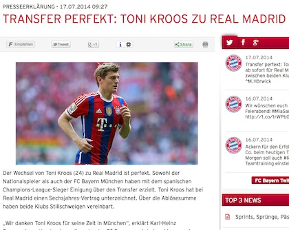 Точно в 10:27 часа тази сутрин Байерн (Мюнхен) официално обяви раздялата с Тони Кроос, който потегля към Реал Мадрид. Баварците обаче разкриват, че халфът е подписал с испанския колос за 6 години, а не за 5 години, както твърдяха повечето медии досега.