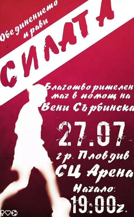 Вени е едно талантливо и устремено момиче, сърцато и добро, но подобни неща, за жалост, се случват и на най-добрите хора. След катастрофата тя изпадна в кома, но за щастие се събуди и премина успешно първата операция на таза. Следва най-важния мач в живота й, и ние сме до нея, за да я подкрепим! Мачът ще бъде на 27.07. (неделя) от 19:00ч. на терена на СЦ "Арена" в град Пловдив. Всеки, който иска да помогне, ще може да да пусне сума по негово желание в кутиите за дарения, и после да се наслади на играта на талантливите футболистки от "Екомет-90". Ще има и дребни артикули, които ще могат да бъдат закупени.