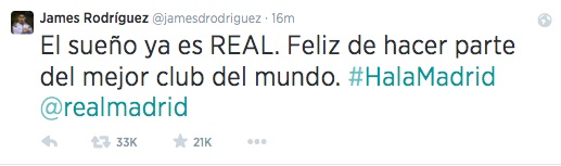 Новата суперпридобивка на Реал Мадрид Хамес Родригес сподели първите си емоции след официализирането на трансфера си на "Сантиаго Бернабеу". "Мечтата вече е РЕАЛна. Щастлив съм, че съм част от най-добрия клуб в света. Hala Madrid", написа новият номер 10 на "белите" в социалната мрежа Twitter.