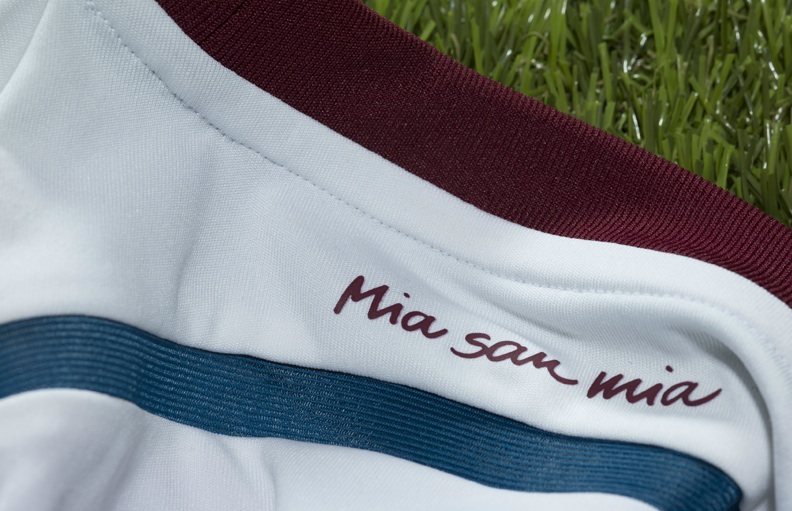Подобно на домакинския екип, новата фланелка включва в задната част на яката думите “Mia San Mia” – немското мото, с което се гордеят всички фенове на Байерн. В превод то гласи – „Ние сме това, което сме“. Допълнително името на отбора също е изписано в задната част на екипа. Шортите са също издържани в бяло и допълнени от линии в тъмно червено и синя хоризонтална лента.