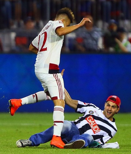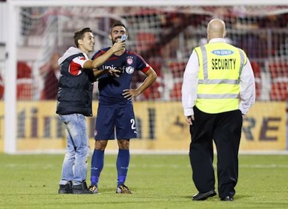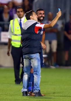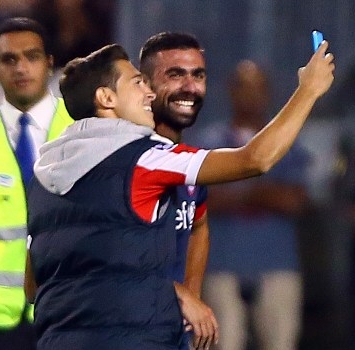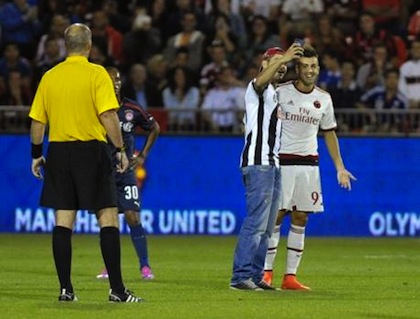 Фен си направи "селфи" с нападателя на Милан Стефан Ел Шаарауи по време на контролата на "росонерите" с Олимпиакос снощи. Друг запалянко пък се снима с Янис Маниатис от гръцкия тим. Елините разбиха Фараона и компания с 3:0 в Торонто в двубоя от приятелския турнир "Гинес Интернешънъл Чемпиънс Къп".
