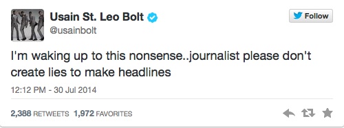 Болт сподели, че тази "новина" е абсолютна безмислица и не е казвал подобно нещо. Ямайският феномен изрази недоволството си в профила си в Туитър.