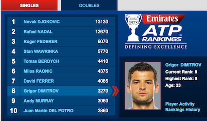 Григор Димитров продължава да изкачва върхове и да чупи рекорди. Въпреки че миналата седмица пропусна турнира във Вашингтон заради грип, 23-годишният българин направи нова крачка нагоре в световната ранглиста на АТР и вече е №8.