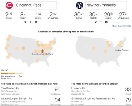 За сравнение, последният в класацията Ню Йорк Янкис не продава почти нищо извън до болка познатите марки в семействата на "Будвайзер" и "Куурс". Това е основната причина "янките" да са на 30-о място в общото класиране, на 30-о място по местно разнообразие, на 29-о по качество на продуктите и на 27-о по уникалност на предлагането.