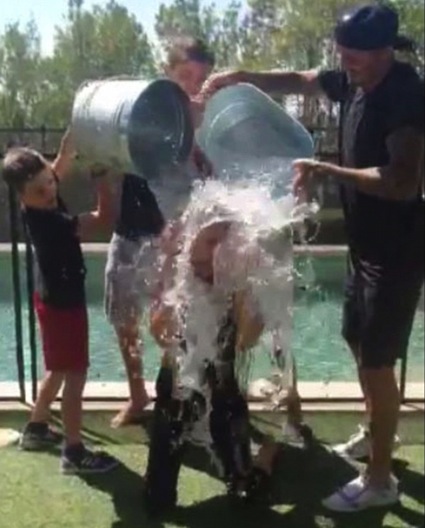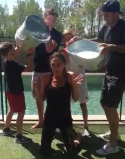 Виктория Бекъм също се впусна в прословутото предизвикателство на ледената кофа. Съпругата на Дейвид Бекъм коленичи пред басейна и предостави удоволствието от заливането на мъжа си и тримата им синове - Бруклин, Ромео и Круз. Виктория беше номинирана от Ева Лонгория и реши, че ще отвърне на удара, като покани Том Форд, Кейти Холмс и малкия Круз.