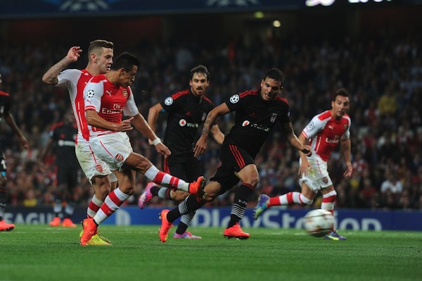 Срещата започна с очакван натиск на домакините и първата голова възможност се откри пред Уилшир, но след серия от финтове в наказателното поле, той отправи удар, който мина встрани от вратата. Арсенал владееше инициативата, но Алексис оставаше изолиран от играта. Чилиецът се луташе по терена в опит да заблуди защитата на Бешикташ, но рядко влизаше в комбинации със съотборниците си.