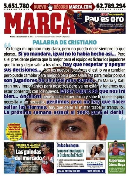 Другият водещ спортен ежедневник в Испания - "АС", също поставя словата на Роналдо на първата си страница. Според испанските медии думите на Кристиано са продиктувани от раздялата с Анхел ди Мария и Чаби Алонсо, които бяха важна част от ядрото на "белите".