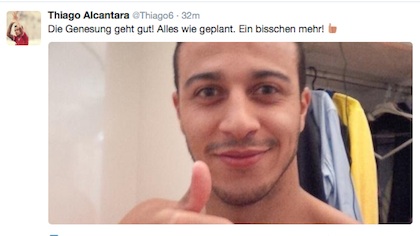 Халфът на Байерн (Мюнхен) Тиаго Алкантара шокира всички фенове на клуба с днешната публикация в профилите си в социалните мрежи. Вчера спортният директор на шампионите Матиас Замер обяви, че има усложнения в процеса на възстановяването на играча от тежка контузия и скорошно завръщане на терена изглежда нереално. Днес обаче роденият в Италия Тиаго качи своя усмихната снимка, на която пише "Възстановяването върви по план! Всичко е, както го очаквахме... Още мъничко!"