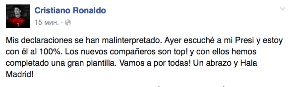 Лидерът на Реал Мадрид Кристиано Роналдо се опита да тушира напрежението на "Сантиаго Бернабеу", заставайки зад президента Флорентино Перес. "Думите ми бяха грешно интерпретирани", написа CR7 в социалната мрежа Facebook.