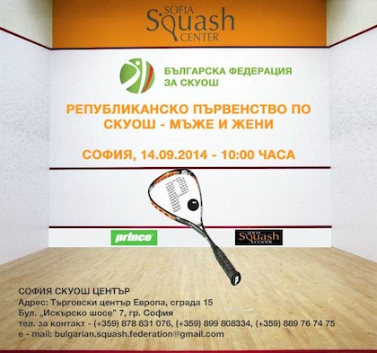 София скуош център ще бъде домакин на републиканското първенство по скуош за мъже и жени, което ще се проведе тази неделя (14 септември). Двубоите започват в 10,00 часа, а мястото се намира на бул. "Искърско шосе" №7, Търговски център "Европа", сграда 15.