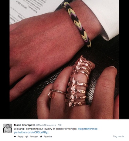 Носителката на пет титли от Големия шлем публикува в профила си в Twitter снимка, а под нея написа следния коментар: "С Диди сравняваме бижутата, които сме избрали за тази вечер".