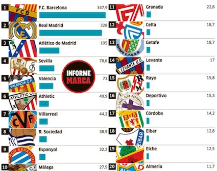 Сложната калкулация сочи, че от "Камп Ноу" годишно са готови да платят 347,9 милиона евро. Изненадващо европейският шампион Реал е заделил по-малко (328 млн.) въпреки постоянно прииждащите скъпоплатени звезди. Причината за това лидерство на Барса е, че ядрото от футболисти на "блаугранас", постигнали големите успехи преди години, са си извоювали тлъсти възнаграждения.