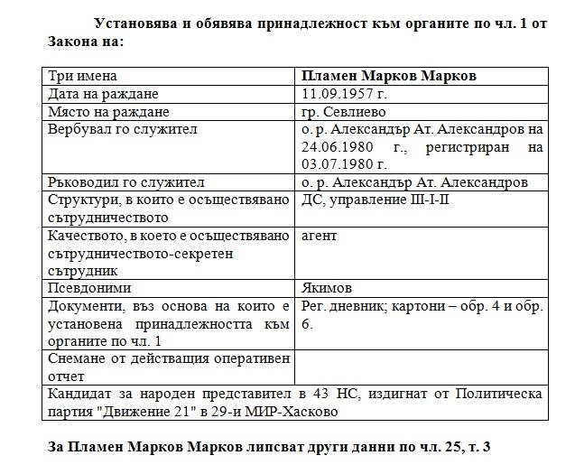 Един от големите футболисти на ЦСКА Пламен Марков е бил агент на Държавна сигурност. Това разкриха от комисията по досиетата, след като отвориха документите на кандидатите за народни представители.