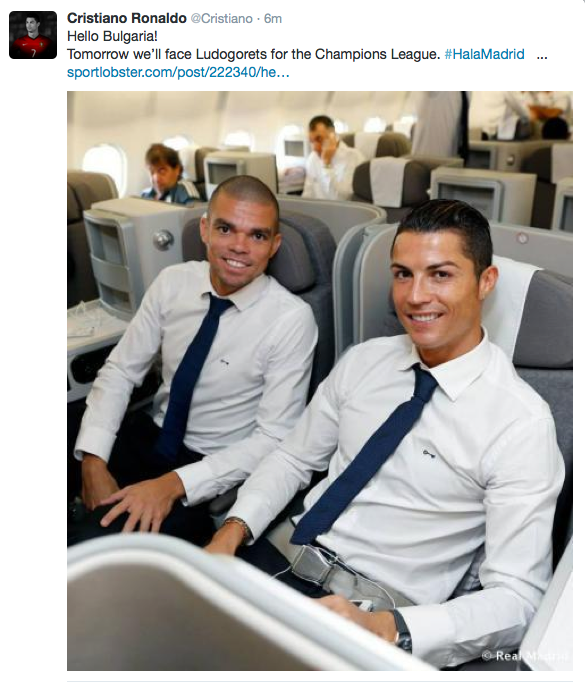 Голямата звезда на Реал Мадрид Кристиано Роналдо поздрави България през официалния си профил в "Twitter". Португалецът написа "Здравей, България! Утре ще играем срещу Лудогорец в Шампионската лига" и си пусна снимка със съотборника си Пепе от самолета на път за София. Кристиано очаквано предизвика най-голям интерес сред феновете на летището с столицата, но заради мерките за сигурност никой от чакащите не успя да се докосне до Роналдо.