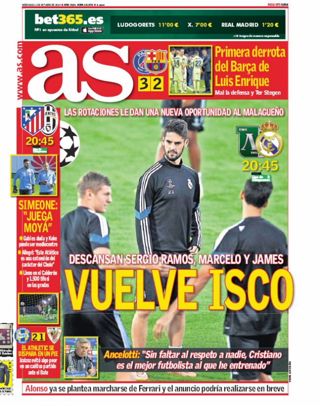 Старши треньорът на Реал Мадрид Карло Анчелоти ще даде почивка на някои важни фигури за тазвечершния мач с Лудогорец от група "В" на Шампионската лига. "Серхио Рамос, Марсело и Хамес ще почиват. Иско се завръща", твърди вестник "АС" на първата си страница.