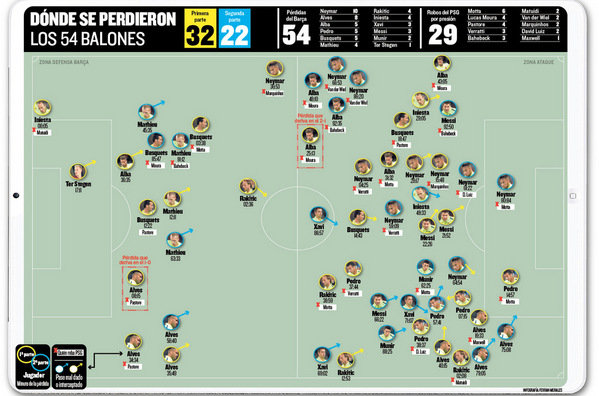 В днешния си брой каталунският вестник "Мундо Депортиво" анализира поражението на Барселона от Пари Сен Жермен. Футболистите на Луис Енрике са загубили цели 54 топки, за да позволят на съперника да контраатакува. През първото полувреме "блаугранас" са били по-отчайващи - 32 загубени топки (7 в първите 10 минути) срещу 22 след почивката.